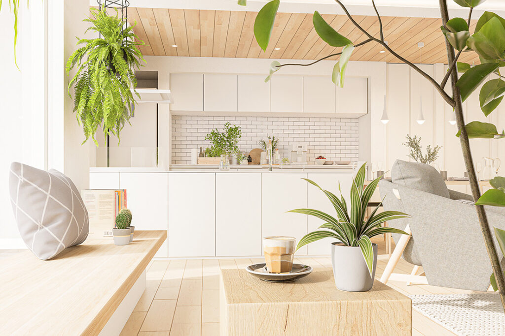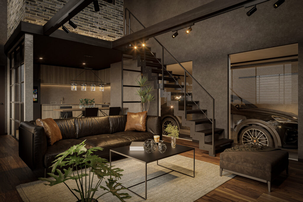 内観のテイストに合わせて、家具や照明、インテリア雑貨をセレクトし、バランスよく配置します。