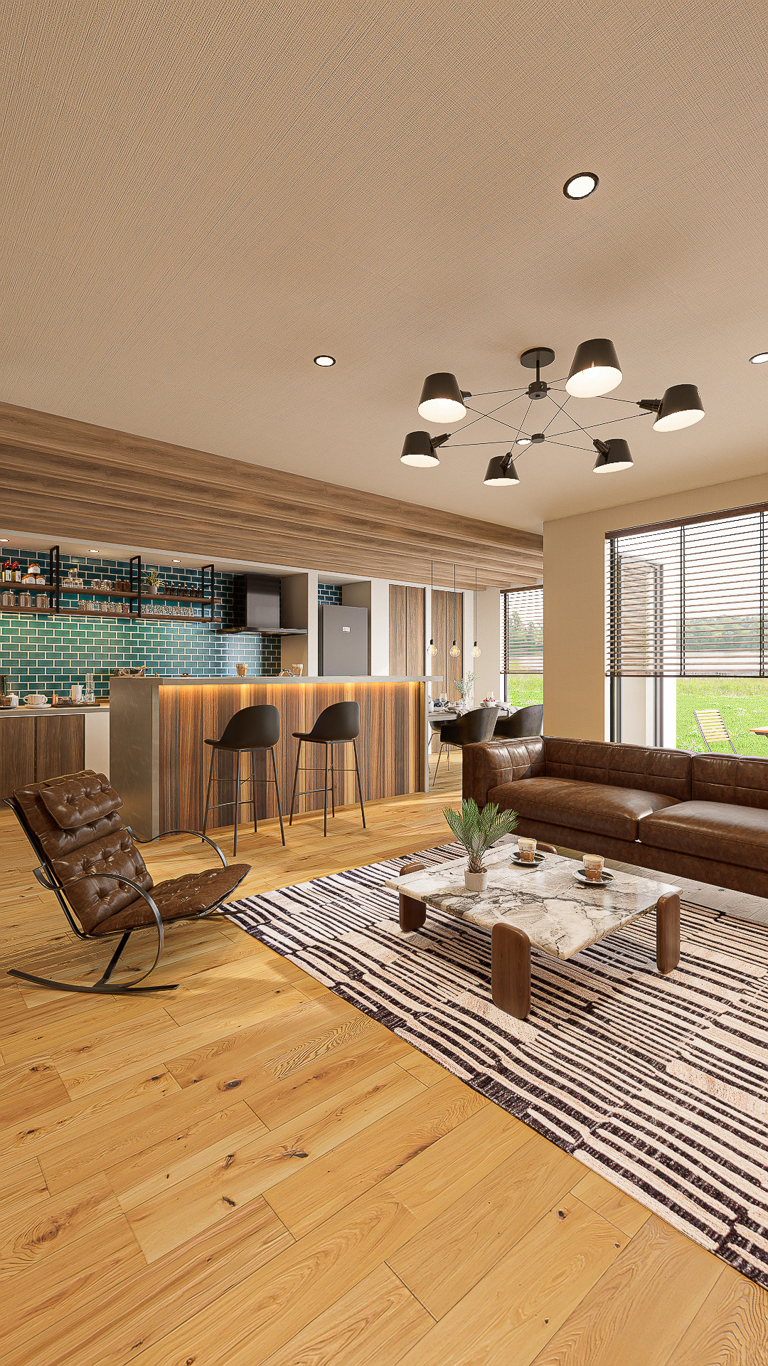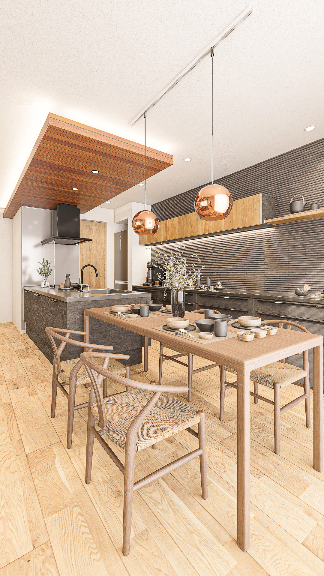 木の質感とタイル・照明のアクセントが、まるでお気に入りのカフェのような心地よさを演出。