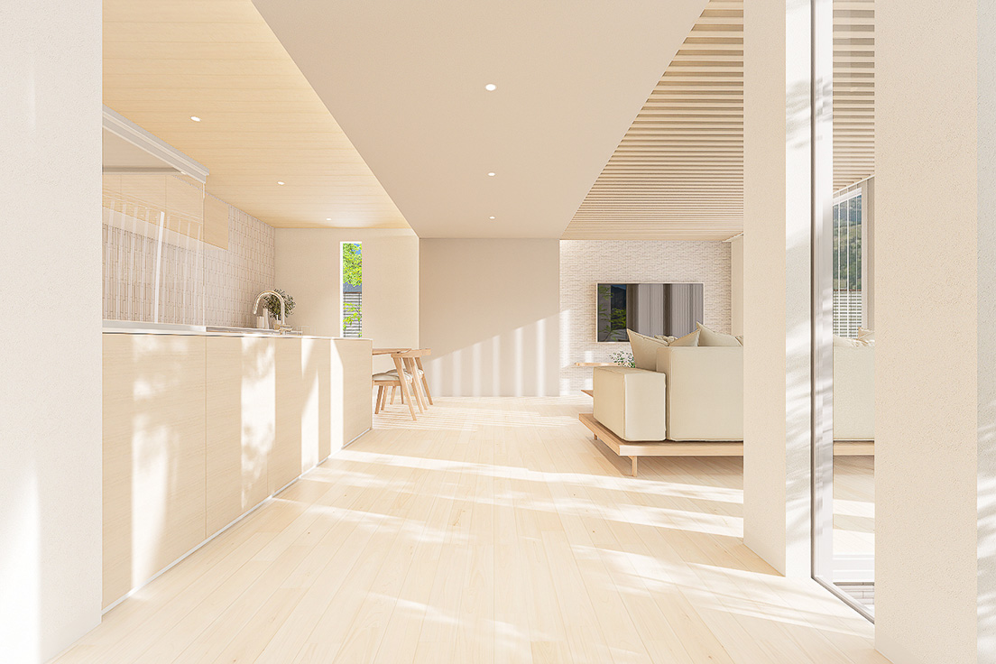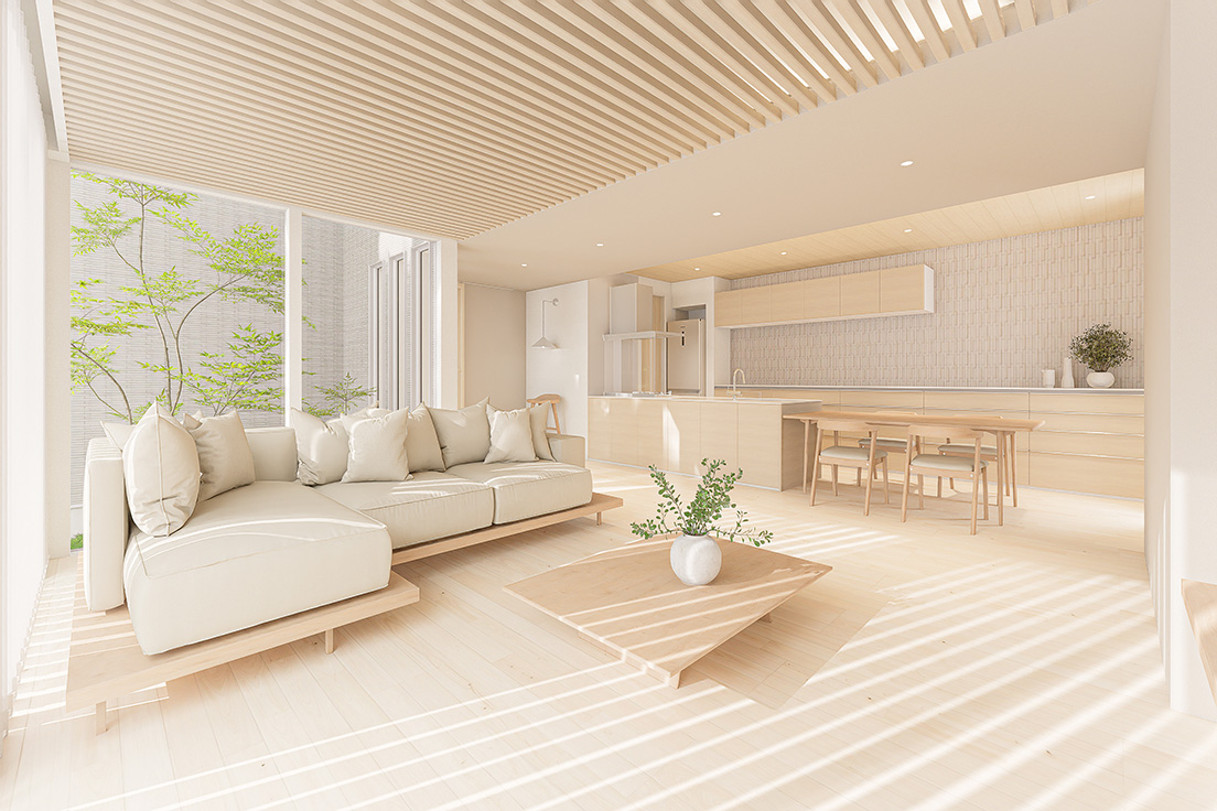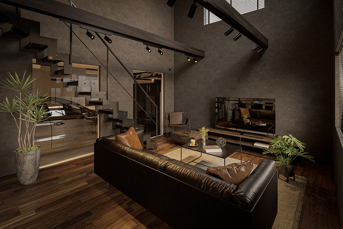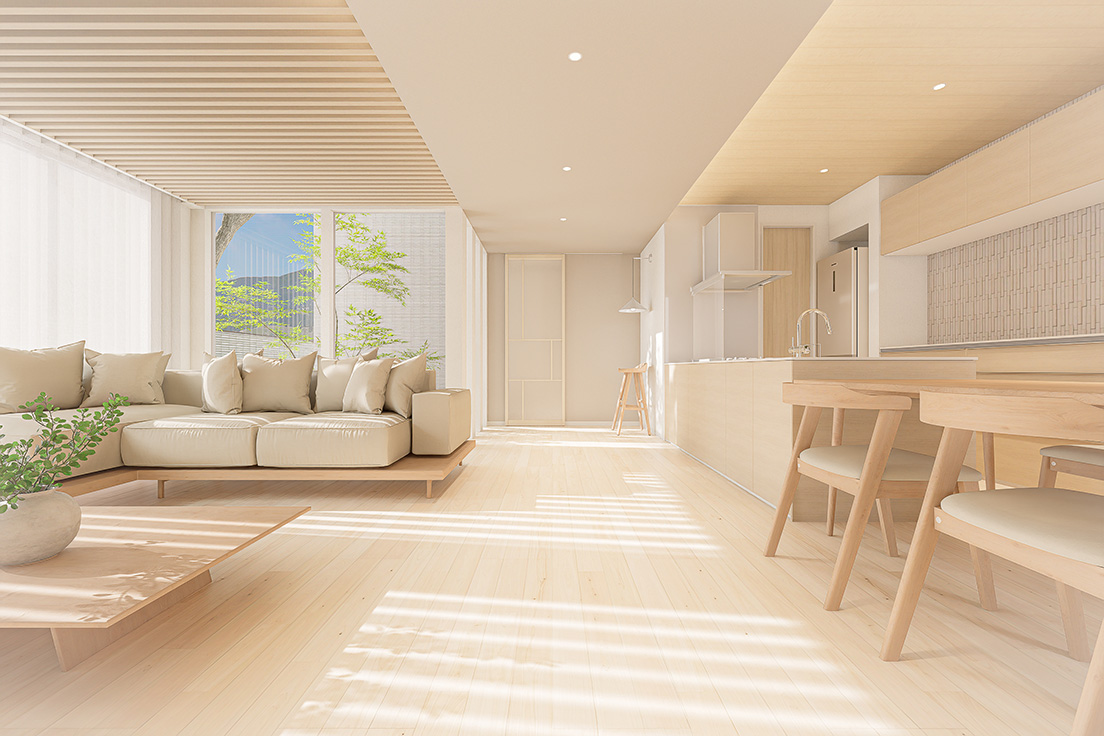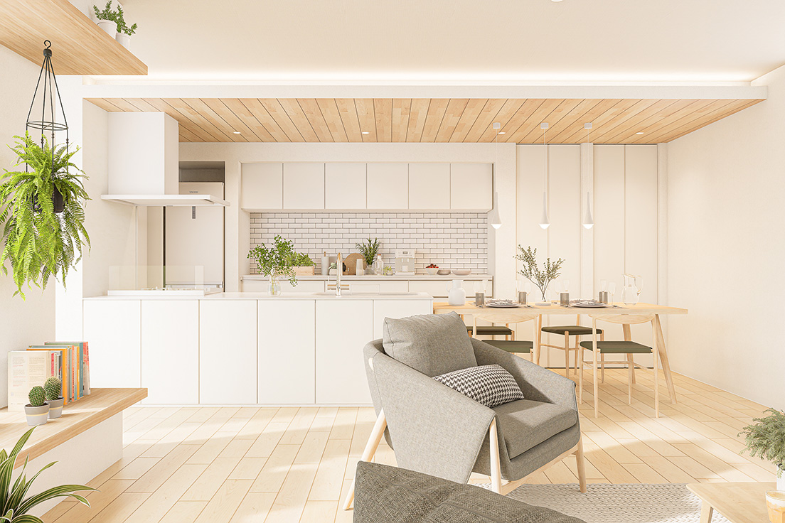 図面上の間取りに、最新のインテリアトレンドや光の演出を掛け合わせ、購入後の暮らしが自然に想像できる内観パースを制作しています。