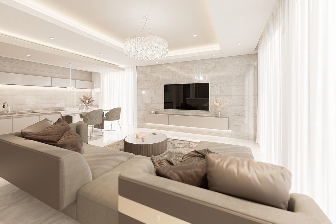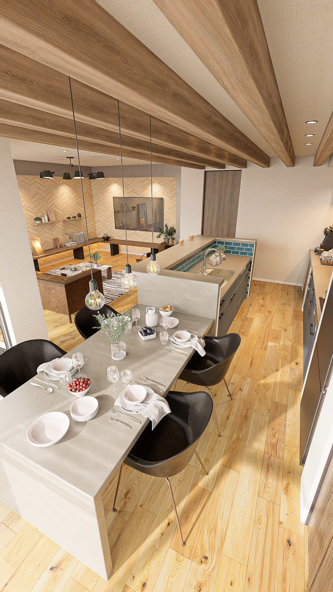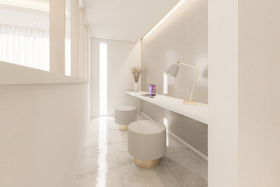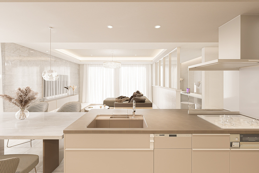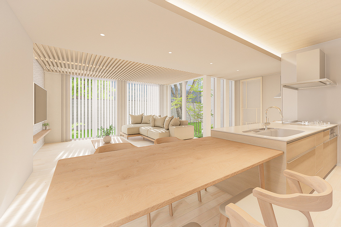 図面上の間取りに、最新のインテリアトレンドや光の演出を掛け合わせ、購入後の暮らしが自然に想像できる内観パースを制作しています。