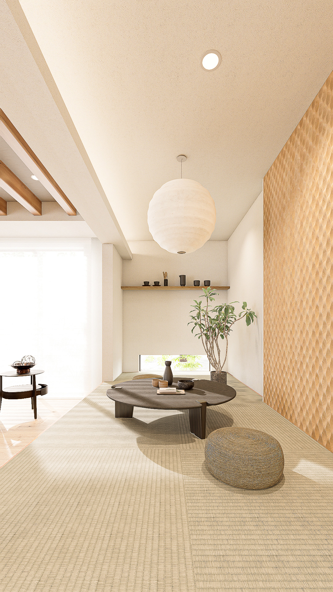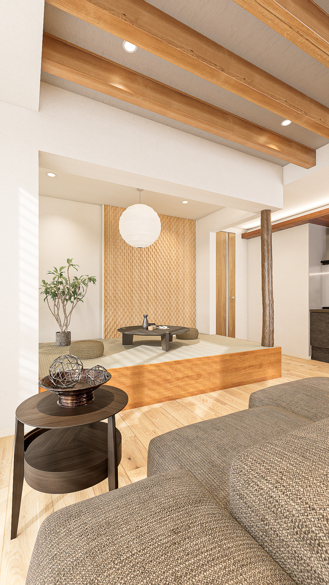 木や畳の自然素材にモダンな意匠を掛け合わせた、落ち着きと洗練が共存するスタイル。