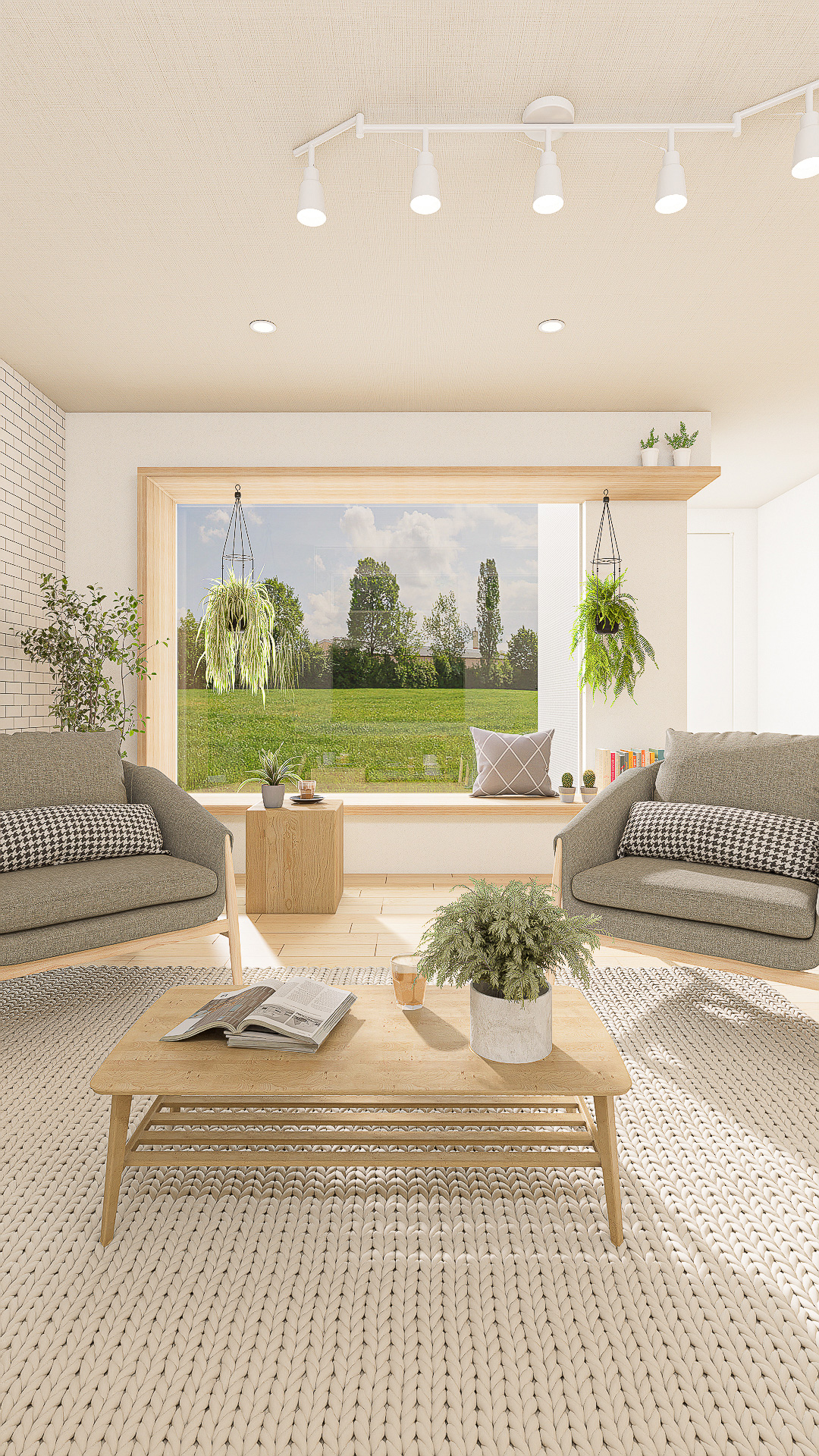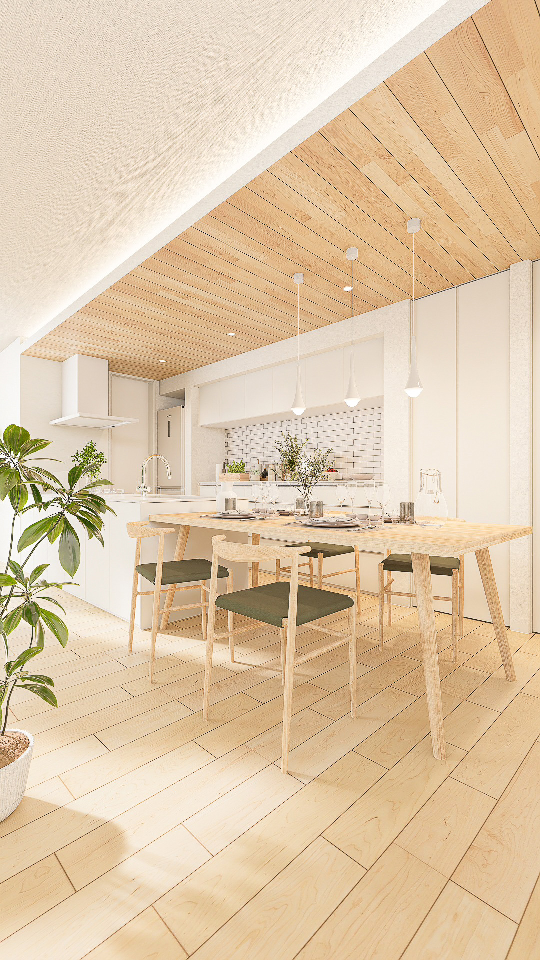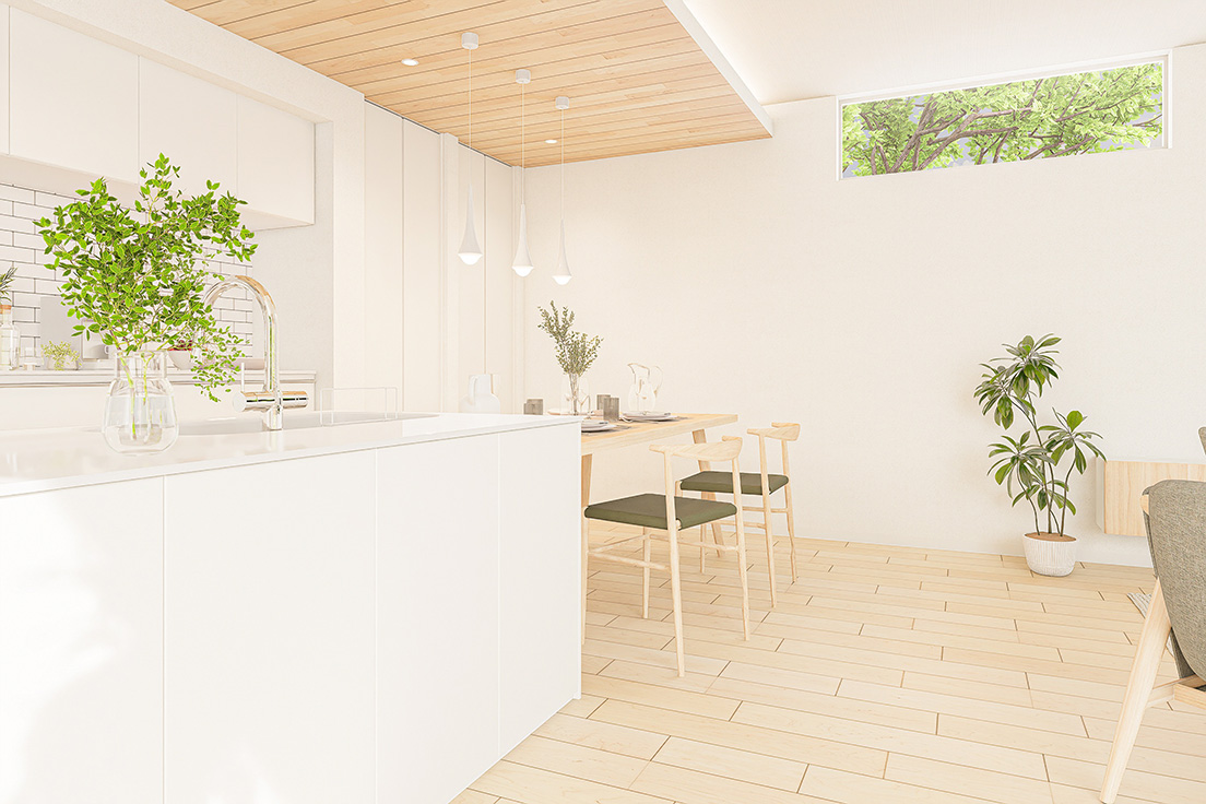 明るい木目と白を基調に、自然光とグリーンが心地よく調和するスタイル。