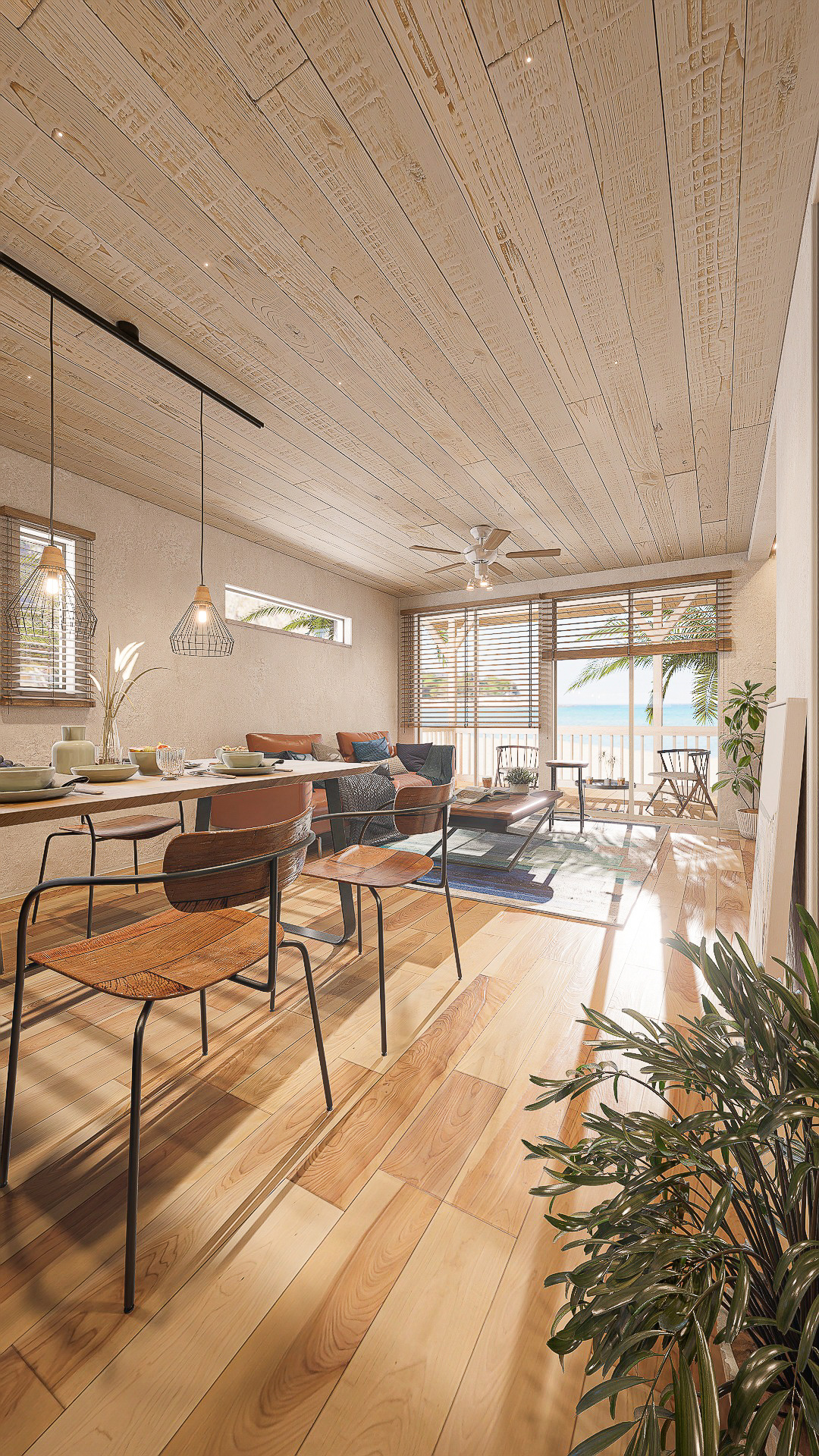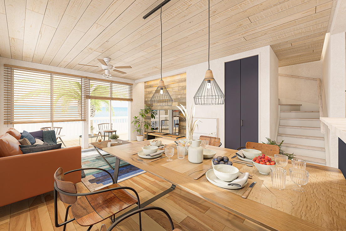 自然素材と明るいカラーを組み合わせ、海辺のような暮らしを求めるファミリー層や若年層に人気です。